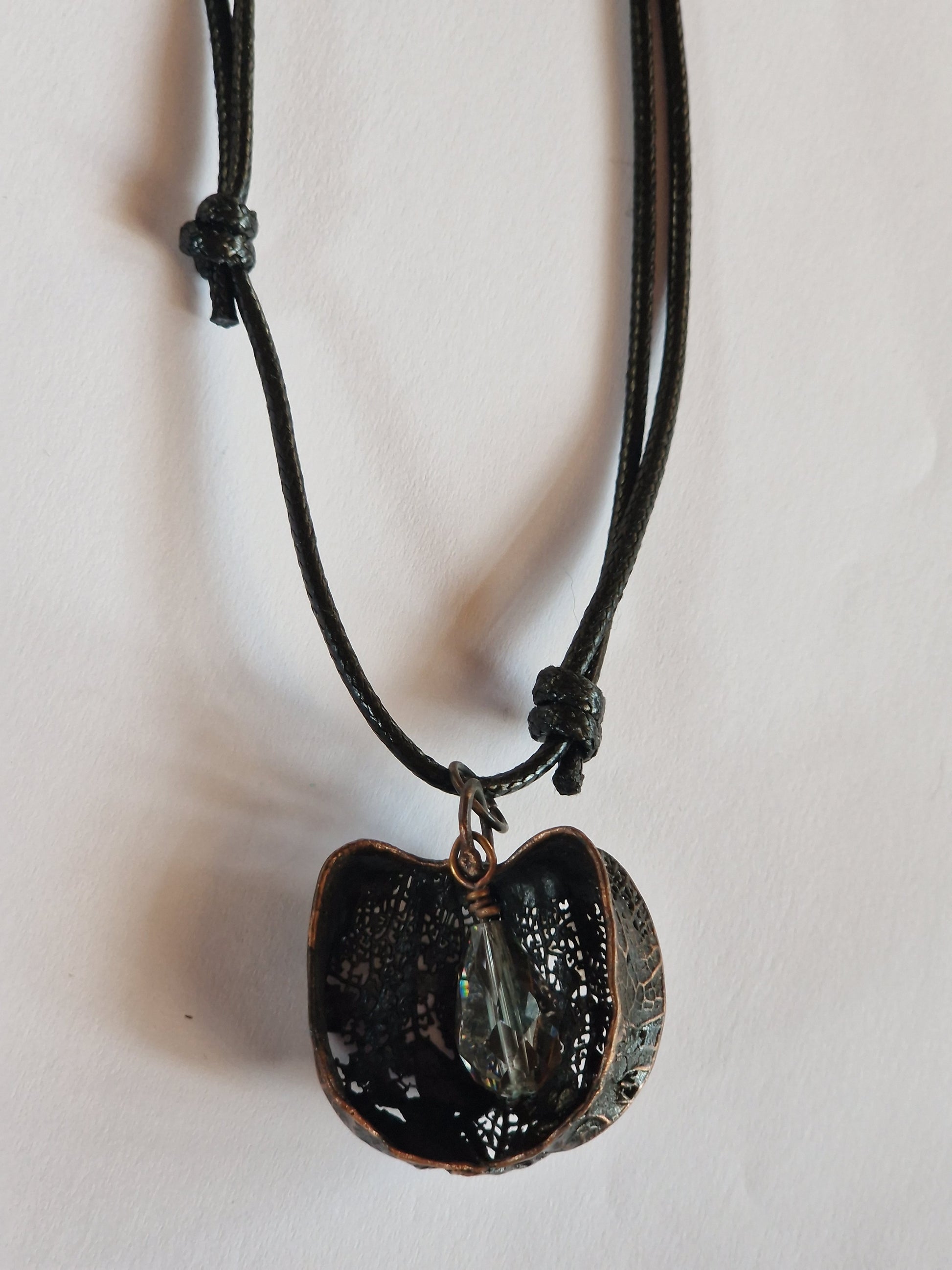 Dieses außergewöhnliche Schmuckstück vereint natürliche Zartheit und magische Handwerkskunst. Aus einer echten halben Physalis gefertigt und in kunstvoller Galvanoplastik mit feinem Kupfer überzogen, wurde ihre filigrane Struktur dauerhaft bewahrt. Im Inneren schimmert eine facettierte Glasperle, die das Licht einfängt und geheimnisvoll reflektiert – wie ein Tropfen Licht in einer Blütenschale.